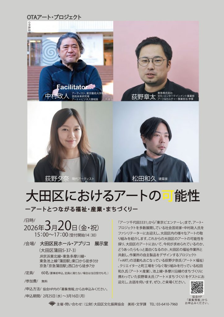Powitamy troje gości, którzy opowiedzą nam o przyszłych możliwościach sztuki w dzielnicy Ota Ward, a także o tym, jakie są obecne potrzeby świata sztuki w dzielnicy Ota Ward i jak można go uczynić ciekawszym.